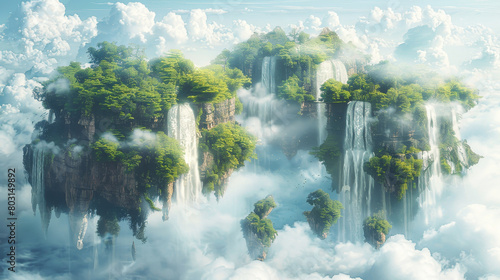 Mystical floating islands with waterfalls among clouds in a tranquil sky
