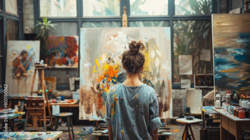 Female artist contemplates finished paintings in a vibrant, messy art studio