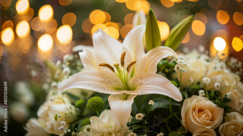 Elegant floral arrangement with a lily centerpiece and glowing background lights