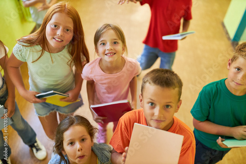 Smiling schoolkids standing together in hallway