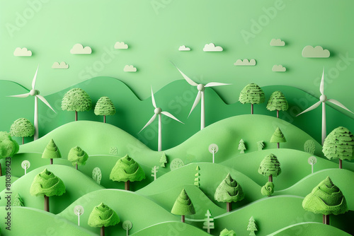 Serene landscape with wind turbines on lush green hills under a clear sky