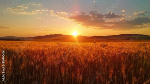 Stunning sunset over a golden wheat field with vibrant sky and rolling hills in background