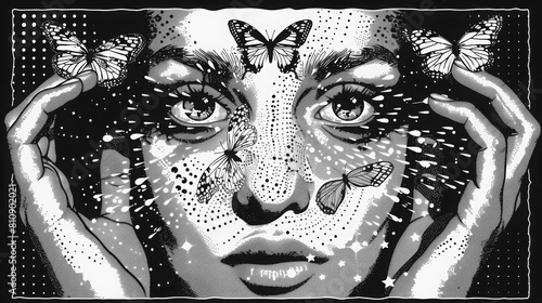 Black and white illustration of a woman with butterflies, portraying nature and emotions