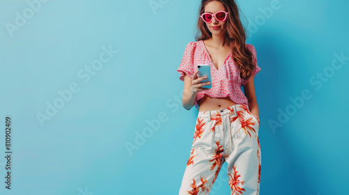 Young woman in stylish summer outfit with smartphone against blue background