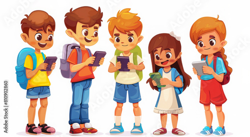 Group of cartoon kids playing games on mobile phones, diverse and happy