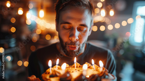 Man blowing out birthday candles on a cake making a heartfelt wish