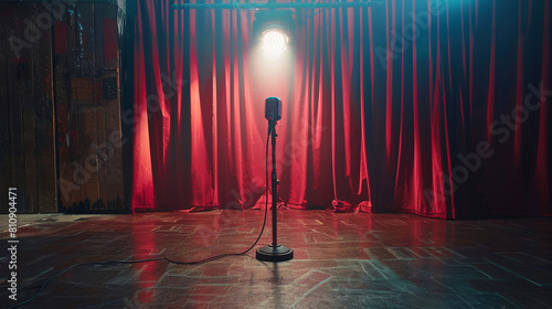 Empty stage illuminated by spotlight with vintage microphone awaiting performance