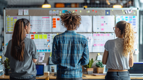 Team of three professionals analyzing project on wall board in modern office