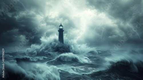 Dramatic stormy ocean with lightning illuminating a solitary lighthouse set against ominous clouds