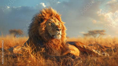 Majestic lion basking in the African savannah sunset, a portrait of wildlife