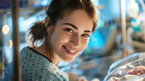 Neonatal nurse smiling while caring for a newborn in a hospital setting