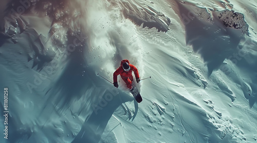 Aerial view of a solitary snowboarder carving fresh tracks in untouched mountain snow