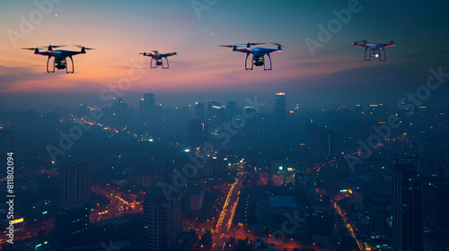 Illuminated urban skyline at night with drones hovering above city lights