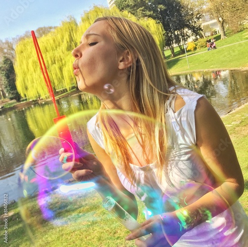Joyful young woman surrounded by colorful confetti and bokeh lights