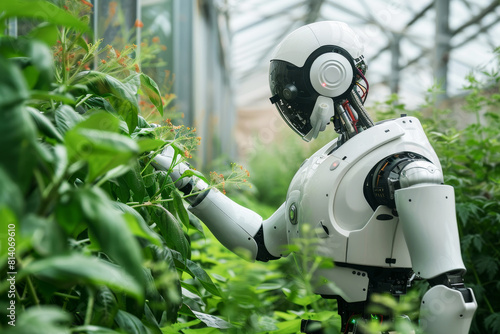 Humanoid robot working in an organic greenhouse, nurturing plants