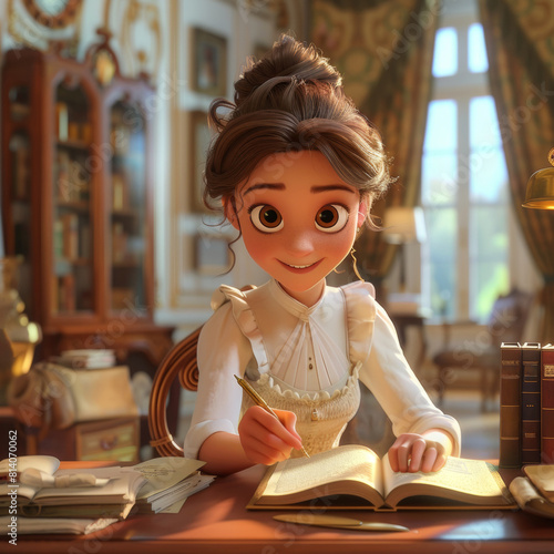 Young woman in elegant attire writing notes in a classic library