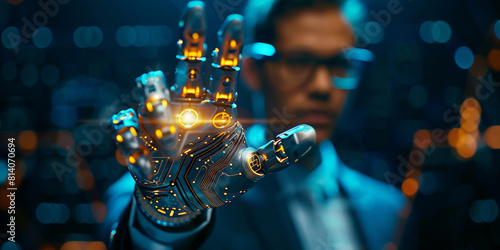 Businessman interacting with an advanced robotic hand in a futuristic technology concept