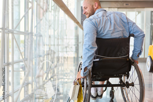 Man in wheelchair navigating a shopping mall, showcasing accessibility and daily life scenes