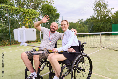 Two friends, one using a wheelchair, enjoying a tennis game and taking a selfie with medals