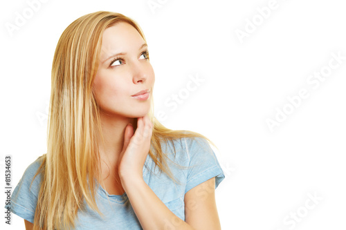 Nachdenkliche junge blonde Frau schaut zur Seite