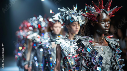 Futuristic runway show featuring models in avant-garde attire with metallic and reflective embellishments
