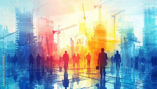 Modern digital illustration of professionals at a vibrant construction site