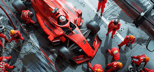 Formula 1 pit crew preparing race car during a rainy competition