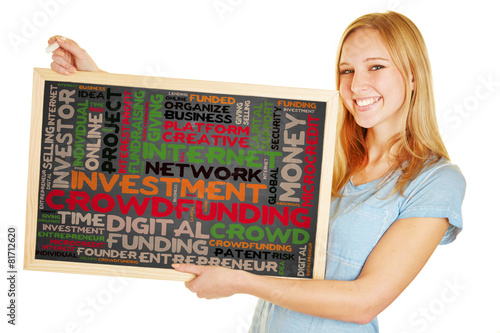 Frau hält Tafel mit Willkommen in vielen Sprachen