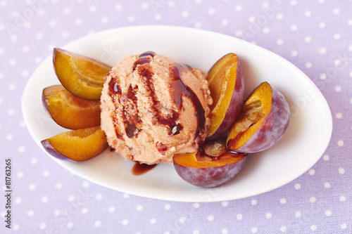 Eisbecher mit Pflaumeneis und Schokoladensauce
