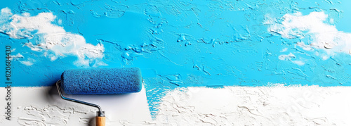 Blue paint roller transforming a white wall, artistic cloud simulation, renovation concept