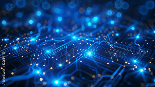 Futuristic digital circuit board with glowing neon lights and abstract connections
