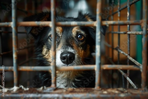 Sad dog in a rusty cage at animal shelter, looking through bars