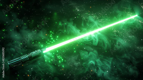 Illuminated green lightsaber against a cosmic background with stars and nebulae