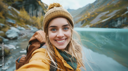 Smiling woman taking a selfie near a scenic lake during a hiking trip