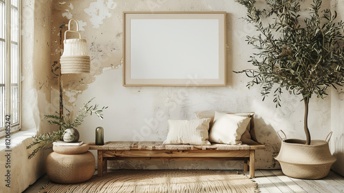 Minimalist Japanese-style interior with wooden bench and natural decor elements