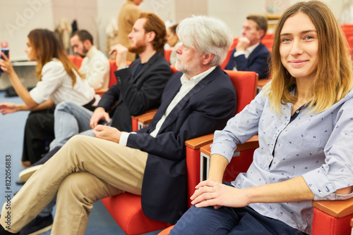 Smiling woman sitting in audience at convention center