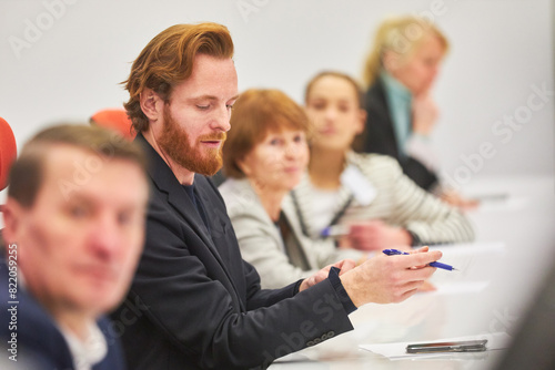 Professional answering during business conference in convention center