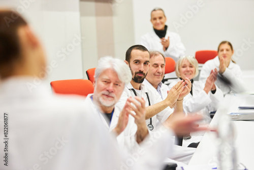 Doctors panel at medical conference applauding in auditorium