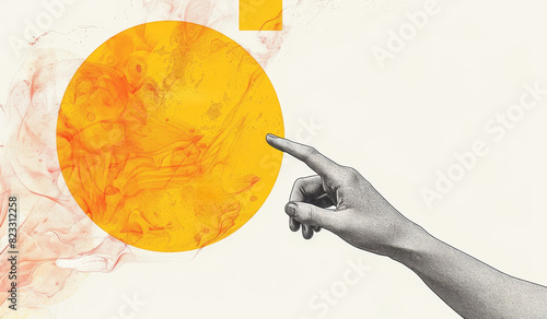 Hand reaching towards a vibrant orange speech bubble in an artistic concept