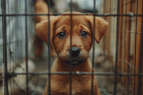 Sad dog in a rusty cage at animal shelter, looking through bars