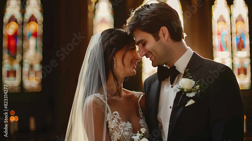 Bride and groom in a historic cathedral during a traditional wedding ceremony