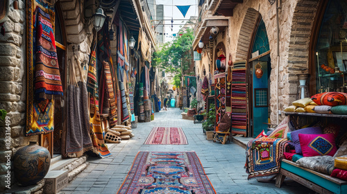 Traditional vibrant bazaar street in the Middle East with colorful handicrafts and lively atmosphere
