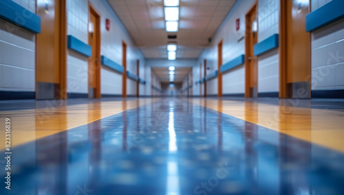 Futuristic sci-fi corridor interior with a view on a bright portal