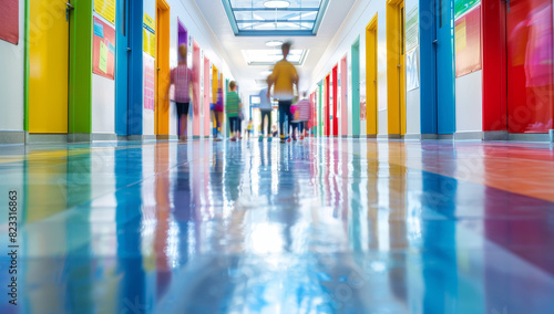 Colorful school hallway with blurred children walking, vibrant doors and educational decorations