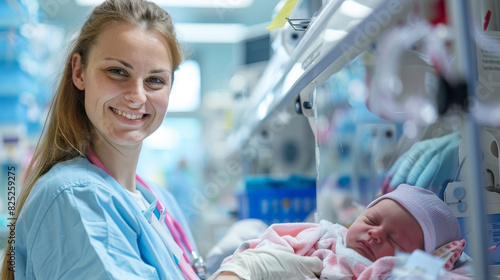 Caring neonatal nurse smiling at the camera in a hospital nursery