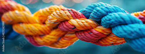 Close-up of vibrant, colorful ropes tied tightly together, symbolizing unity and strength