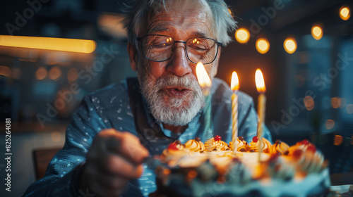 Elderly man joyfully blowing out candles on a birthday cake in a festive setting