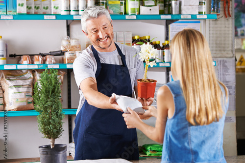 Mann in Gärtnerei verkauft Blumen