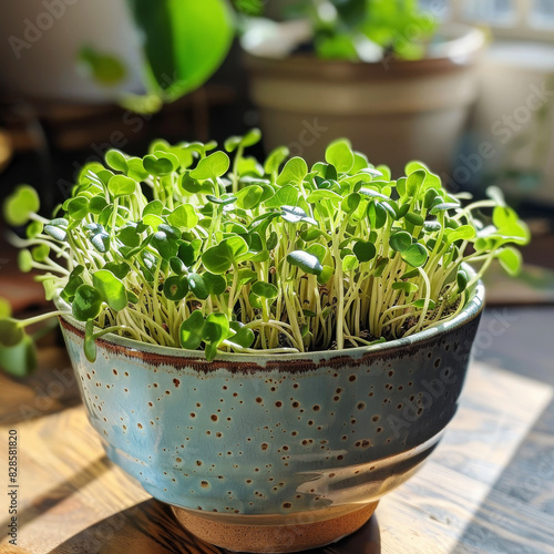 Lush green sprouts thriving in a beautiful ceramic bowl under natural sunlight