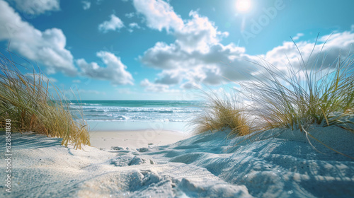 Gorgeous beach landscape with sandy dunes, ocean waves, and bright blue sky